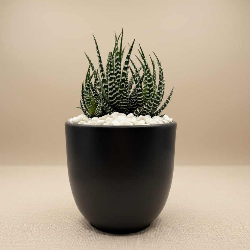 Un vaso in ceramica nera opaca dal design pulito e contemporaneo, perfetto per chi ama l’eleganza senza eccessi. Il contrasto tra il nero intenso e la piantina crea un effetto chic e moderno, capace di valorizzare qualsiasi ambiente con un solo gesto.