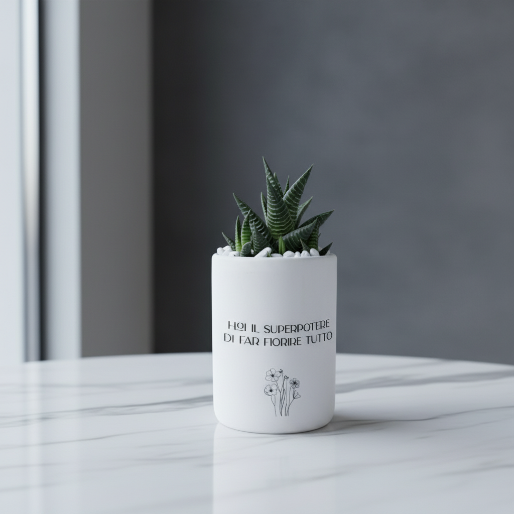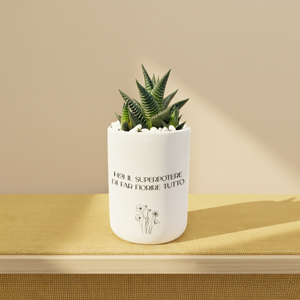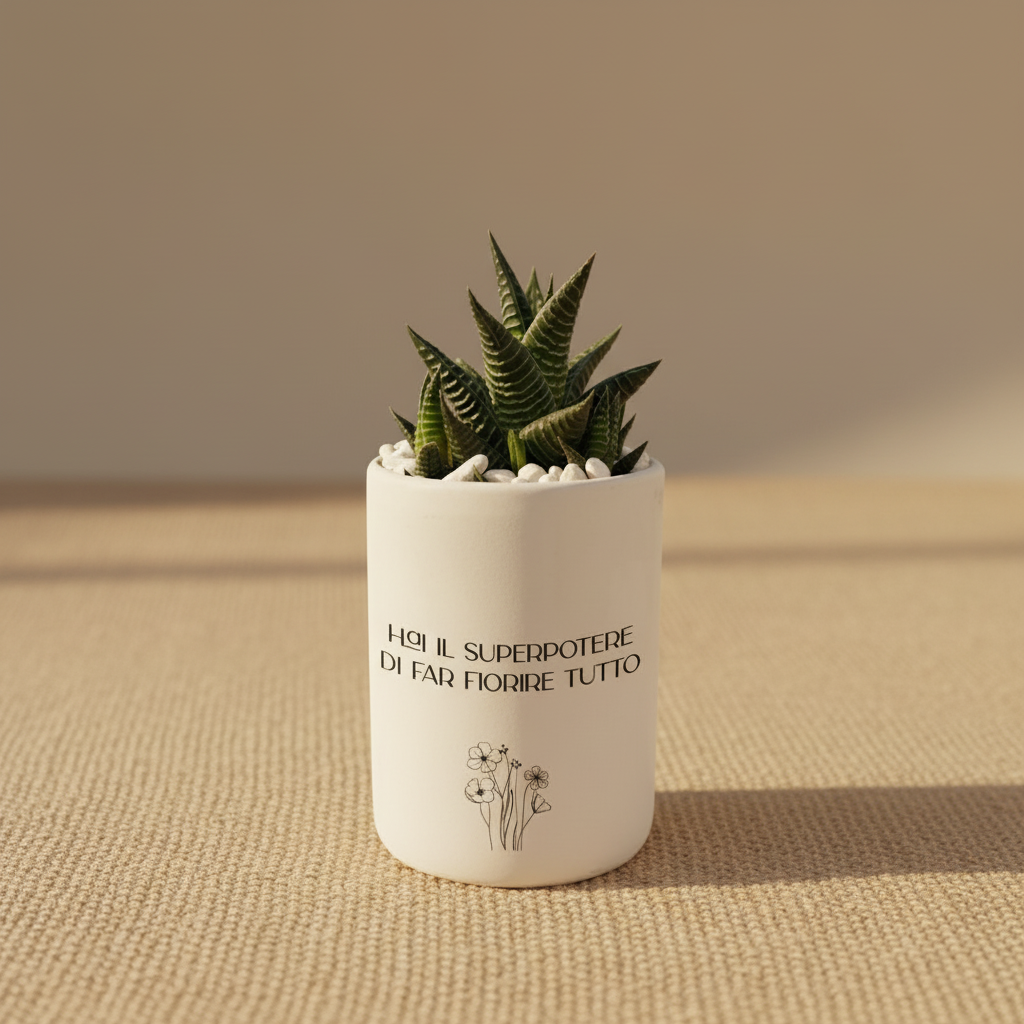 Un pensiero che parla al cuore: un vaso in ceramica artigianale con piantina grassa, impreziosito da una frase dedicata che rende ogni dono unico e personale. Un gesto semplice ma ricco di significato, perfetto per celebrare affetto, gratitudine o un momento speciale.